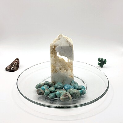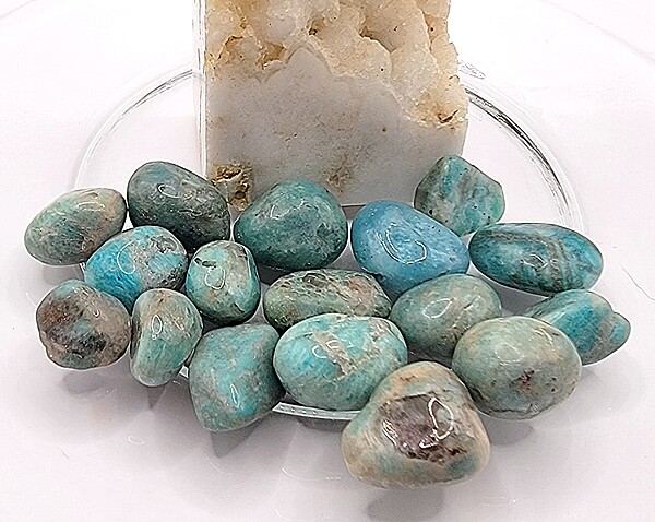 One of our favorite suggestions for using amazonite with smoky quartz tumbles in gemstone décor is to add them to a crystal or glass plate, bowl, vase, or other container. You can layer them or use them to surround figurines or other display pieces, too. With all of the colors and variation available in gemstone tumbles and chips, there is almost always a complementary or accent color that will suit your personal style, Southwestern or otherwise.