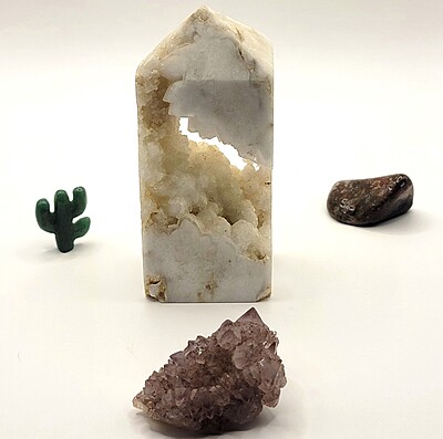 With this amethyst stalactite, we have a fun décor idea—crystal grids. Raw pieces are great for the centerpiece. You can make impressive displays filled with color and wonder.