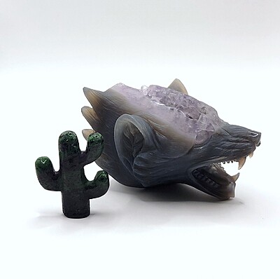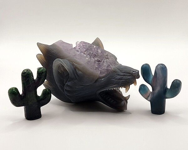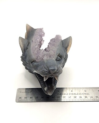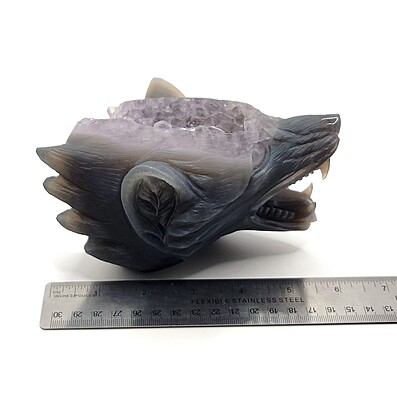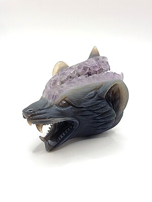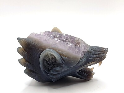 This amethyst wolf head carving is a WYSIWYG.