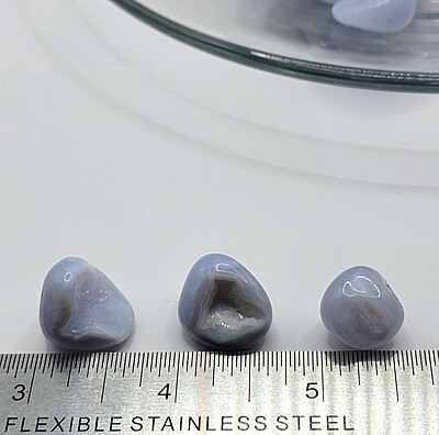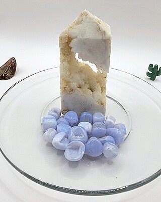 One of our favorite suggestions for using blue lace agate geode tumbles in gemstone décor is to add them to a crystal or glass plate, bowl, vase, or other container. You can layer them or use them to surround figurines or other display pieces, too. With all of the colors and variation available in gemstone tumbles and chips, there is almost always a complementary or accent color that will suit your personal style.