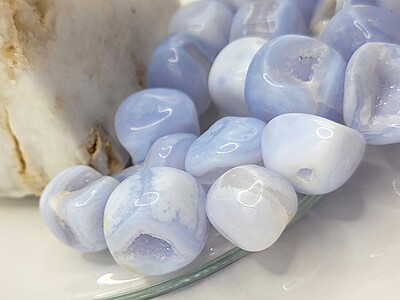 Blue lace agate geode tumbles are great for décor and gemstone collections. These lovely tumbles add a gorgeous pop of color where ever they are placed. Blue lace agate is beloved for both its beautiful banding and wonderful metaphysical properties. These tumbles actually have drusy geodes. In this lot, we also received a few without the drusy geodes and they are for sale as well. We sell these beauties by the piece. Get yours today!