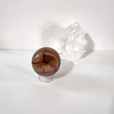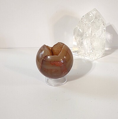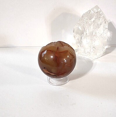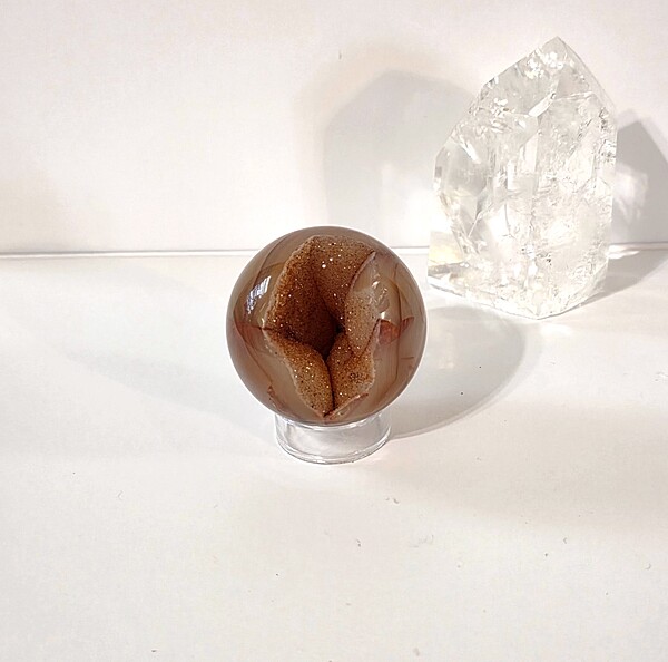 Check out our cherished carnelian geode sphere with a natural opening filled with sparkling drusy crystals. It is a striking collector’s piece or display accent.