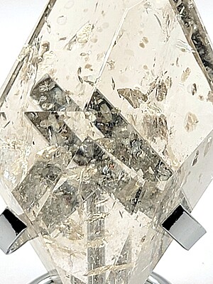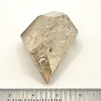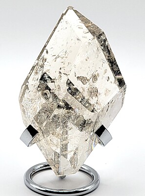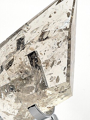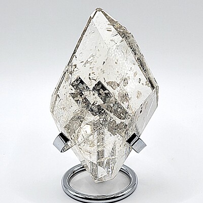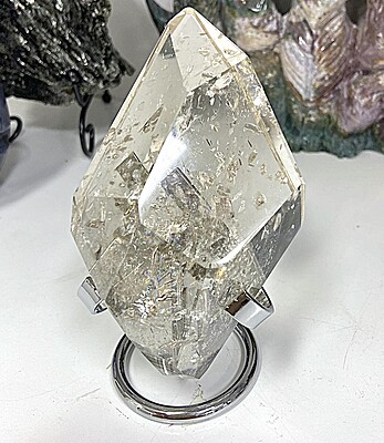 This clear quartz freeform is a showstopper! It has many rainbows and incredible clarity. This lovely piece weighs 315g and stands at 4.56 X 2.68 X 1.68". The lovely stand that comes with it almost makes the piece look like a large diamond set in prongs on a ring. Don't miss out on this fabulous piece!