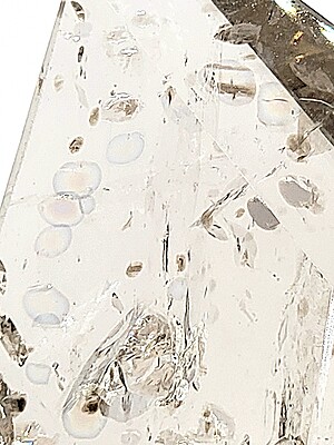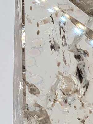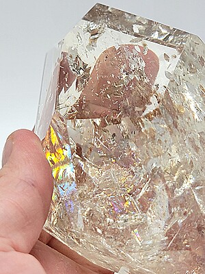 The rainbow flash in quartz crystals, also known as iridescence, is caused by light interacting with tiny fractures and inclusions within the crystal structure. These fractures and inclusions act as prisms, scattering and reflecting light in different directions, creating the beautiful rainbow effect. The specific colors seen in the rainbow flash depend on the size and arrangement of these internal structures within the quartz crystal. This phenomenon is a result of the unique way light interacts with the crystal's internal composition, giving each quartz crystal its own mesmerizing and unique display of colors.