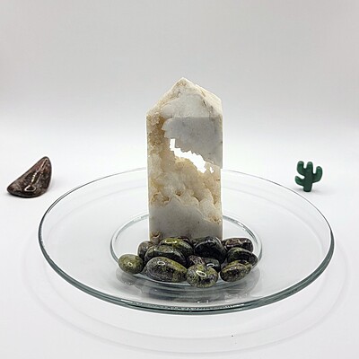 One of our favorite suggestions for using gemstone tumbles in gemstone décor is to add them to a crystal or glass plate, bowl, vase, or other container. You can layer them or use them to surround figurines or other display pieces, too. With all of the colors and variation available in gemstone tumbles and chips, there is almost always a complementary or accent color that will suit your personal style.