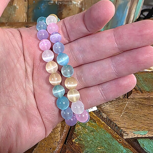 Brighten your accessory collection with our dyed satin spar bracelets, featuring a dreamy palette of pastel colors. Crafted from natural satin spar—a fibrous variety of gypsum often incorrectly marketed as “selenite”—these bracelets are expertly dyed to showcase gentle shades of pink, blue, lavender, mint, and more. Each bead displays the signature silky sheen and subtle shimmer that make satin spar so visually captivating. They make thoughtful gifts for jewelry lovers, color enthusiasts, or anyone looking to add a soft, luminous accent to their collection.