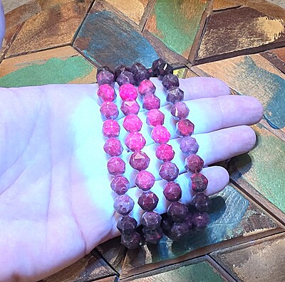 Ruby in kyanite is a distinctive mineral pairing where ruby (a red variety of corundum) forms within a matrix of blue kyanite, a silicate mineral. This combination is most commonly found in regions such as India and Nepal, where specific metamorphic conditions allow both minerals to grow together. The result is a visually stunning contrast: the deep reds of ruby stand out beautifully against the cool, tranquil blues of kyanite, often with natural variations and patterns that make each bead unique.