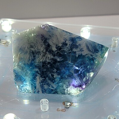 We found the information you want in a Mindat.org thread here which led us to a website that discusses the spectroscopy of this unique form of fluorite. There are many assumptions about the actual chemical composition, as is outlined in the thread cited. The data in this test has shown that the white feather-like inclusions are baryte and quartz. Isn't that interesting?