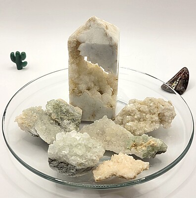 With this green fluorite cluster, we have another fun décor idea—crystal grids. Clusters are great for the centerpiece. You can make impressive displays filled with color and wonder.