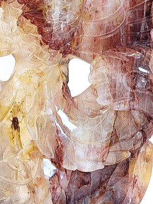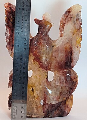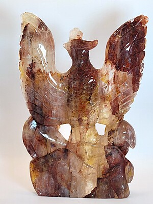 We now have TWO of these incredible hematoid phoenix carvings. The new pieces features both colors of hematoid inclusions—red and gold! This incredible phoenix truly does looks like it is aflame! This beautiful piece weighs approximately 1.62kg (over 3.50lbs.!) and measures about 9.50" tall X 7.00 at its widest point on the wings.