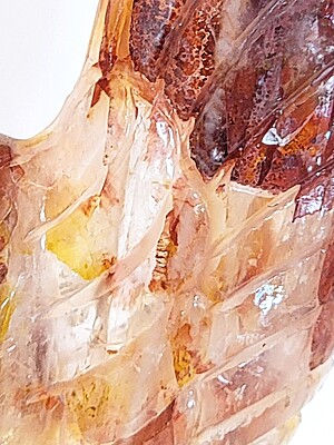 Hematoid quartz is a type of quartz crystal that contains inclusions of iron oxide, giving it a distinctive yellow to red coloration. These colors are a result of the presence of hematite within the quartz structure, which can vary in concentration and distribution, leading to different shades of yellow and red. The iron oxide inclusions can form as thin coatings or needle-like structures within the quartz, creating unique patterns and textures. Hematoid quartz is commonly found in regions where iron-rich minerals are present, and its coloration is a result of natural geological processes.