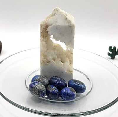 One of our favorite suggestions for using lapis lazuli tumbles in gemstone décor is to add them to a crystal or glass plate, bowl, vase, or other container. You can layer them or use them to surround figurines or other display pieces, too. With all of the colors and variation available in gemstone tumbles and chips, there is almost always a complementary or accent color that will suit your personal style.