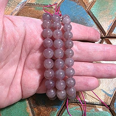 Given that we do not know the exact mineral inclusions, we base any changes in metaphysical uses to those that surround color therapy. For example, these bracelets have a more mauve color. We would then apply any changes in usage to the specific color frequency.