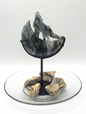This gorgeous moss agate wolf would look great in your living space. This gemstone décor piece comes with the stand. This wonderful piece makes a great birthday or housewarming gift.