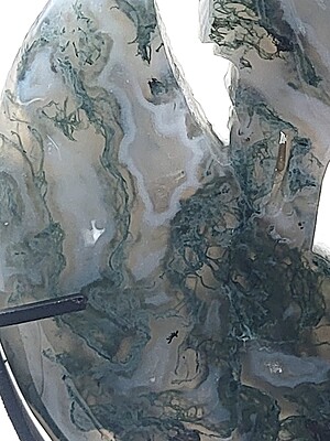 Moss agate is a type of chalcedony that forms in sedimentary environments rich in silica and mineral impurities. The distinctive green moss-like inclusions in moss agate are typically composed of minerals such as chlorite, hornblende, or other manganese or iron oxides. These inclusions create unique patterns resembling moss or ferns within the translucent chalcedony matrix. Moss agate with drusy features small sparkling crystals that coat the surface of the agate, forming a glittering effect. This drusy layer often results from the presence of mineral-rich solutions that seep into cavities or fractures in the agate, crystallizing over time to create the sparkling drusy texture.