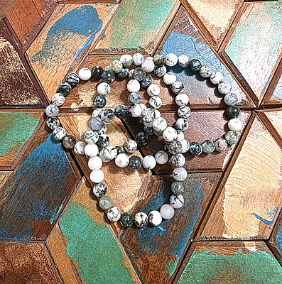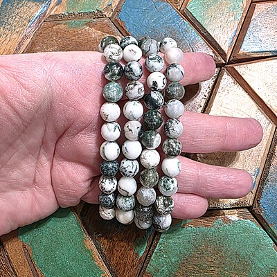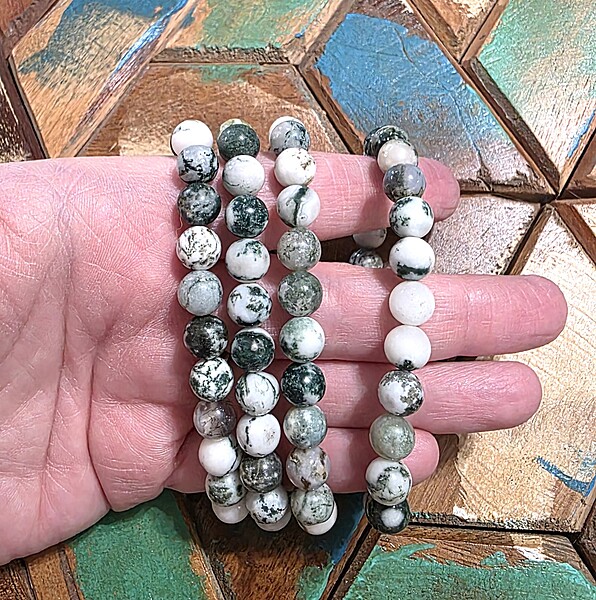 Check out our polished moss agate bracelets with a mix of white and deep green beads. With a wonderful comfortable stretch design, they are perfect for gardening, grounding, and color therapy.