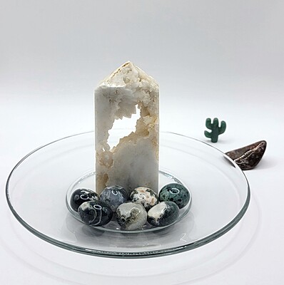 One of our favorite suggestions for using moss agate tumbles in gemstone décor is to add them to a crystal or glass plate, bowl, vase, or other container. You can layer them or use them to surround figurines or other display pieces, too. With all of the colors and variation available in gemstone tumbles and chips, there is almost always a complementary or accent color that will suit your personal style.