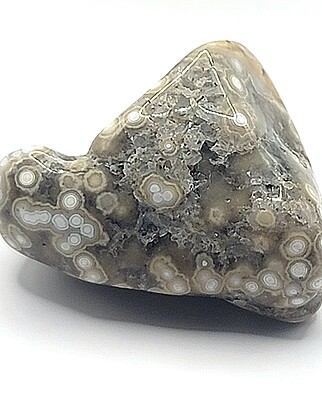 Ocean jasper is actually orbicular jasper that is found along the northwest coast of Madagascar and other regions. It is known for its unique and colorful orb-like patterns, which can include many different colors. The most common are deep greens, white, red, and yellow. Some pieces of ocean jasper may appear translucent due to the presence of agate or quartz within the stone. Although, there are some that have noted jasper inclusions, much of the mineral is not found with jasper at all. Orbicular jasper is not an approved mineral species and is described as: