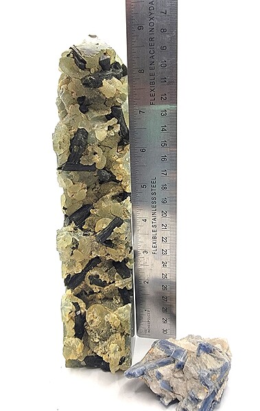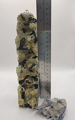 Did you know that there are at least 2 tourmaline-shaped that are commonly found with prehnite that are NOT black tourmaline? In some cases, it is epidote. In others, it is a form of amphibole, often considered actinolite, but could be other members of the amphibole supergroup. Usually, if you know the exact mining location, you will be able to tell whether it is epidote or actinolite. Much of what is found more recently is epidote. They are never black tourmaline, as they are not known to grow together.