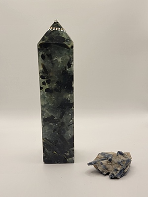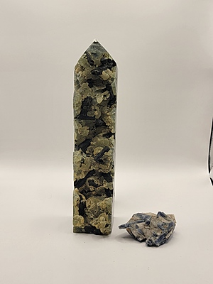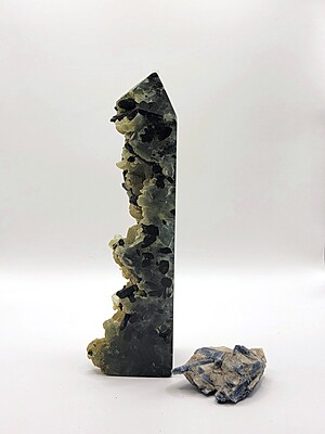 This prehnite with epidote tower is a beast! It stands at 9.00" tall and weights about 1.18kg. There are clearly defined epidote crystal formations throughout. Additionally, the prehnite crystal formations are stunning. There is also some translucence in some areas of the tower. The olivine and black-green colors suit many Southwestern color schemes. This is a great gift or a breathtaking piece of gemstone décor. Don't miss it!