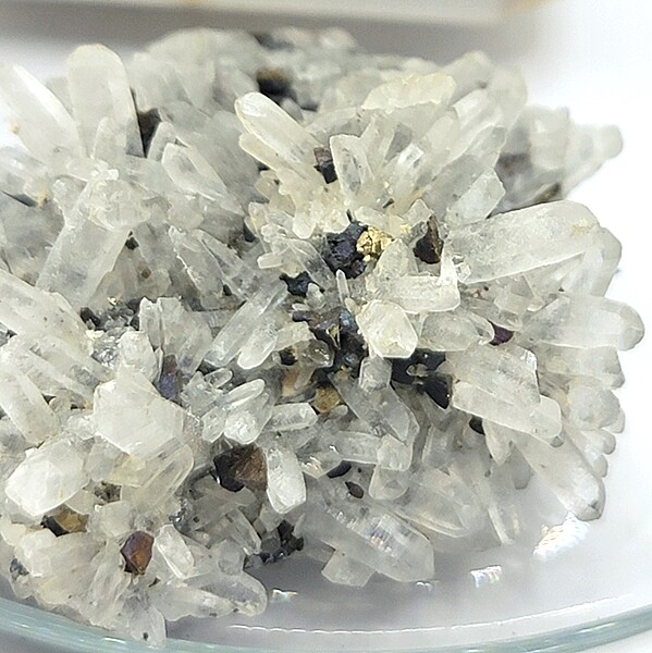 It is not uncommon for quartz clusters to form with chalcopyrite, a copper iron sulfide mineral. Quartz, composed of silicon dioxide (SiO2)), is one of the most abundant minerals on Earth and often forms in association with a variety of other minerals, including chalcopyrite. Chalcopyrite has a chemical composition of CuFeS2, containing copper, iron, and sulfur. This gorgeous combination of quartz and chalcopyrite can be found in mineral deposits around the world, including regions known for copper mineralization such as Peru, Chile, the United States, and Australia. The presence of chalcopyrite within quartz clusters adds a distinctive metallic luster and color contrast to the specimens. Although it is not rare, this piece is certainly a unique marvel of geology.