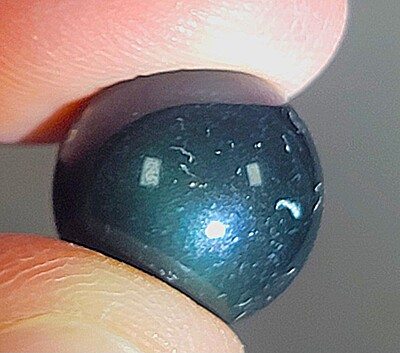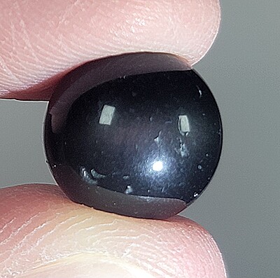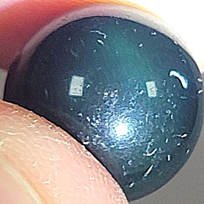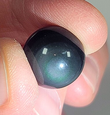 All rainbow obsidian tends to look slick black under normal lighting conditions. When lit up more directly, green, purple, and/or blue bands become apparent in better quality specimens. This colorful banding comes from a specific kind of crystallization that occurs as it is forming. The chatoyancy was difficult to get in our photos, but you can see it in a few of the pictures. Rainbow obsidian has unique colorful chatoyancy that is often referred to as cat's eye.