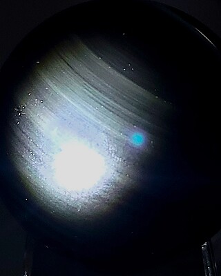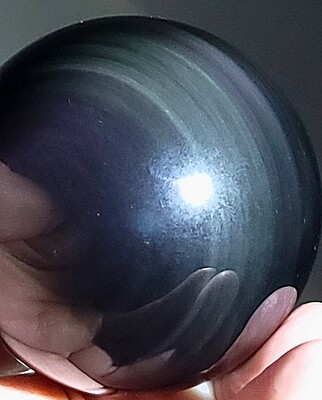Take a look at this amazing rainbow obsidian sphere! It has beautiful banding of green and purple. Don't miss this high quality piece!