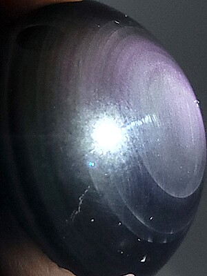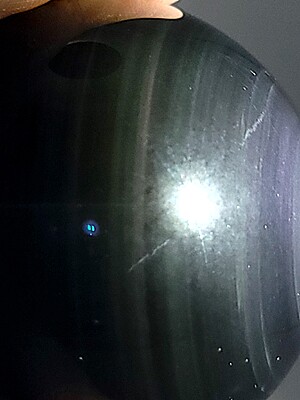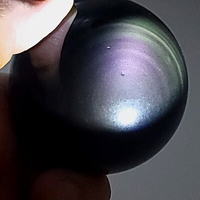 Many rainbow obsidian pieces look slick black under normal lighting conditions. When lit up more directly, green, purple, and/or blue bands become apparent. This colorful banding comes from a specific kind of crystallization that occurs as it is forming. The chatoyancy was difficult to get in our photos, but you can see it in a few of the pictures. Rainbow obsidian has unique colorful chatoyancy that is often referred to as cat's eye.