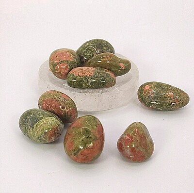 One of our favorite suggestions for using unakite tumbles in gemstone décor is to add them to a crystal or glass plate, bowl, vase, or other container. You can layer them or use them to surround figurines or other display pieces, too. With all of the colors and variation available in gemstone tumbles and chips, there is almost always a complementary or accent color that will suit your personal style, Southwestern or otherwise.