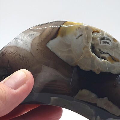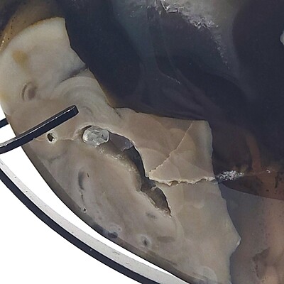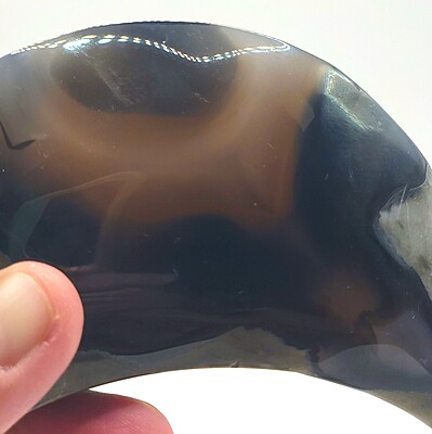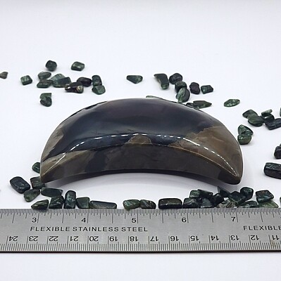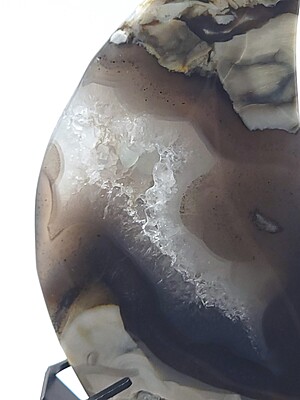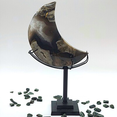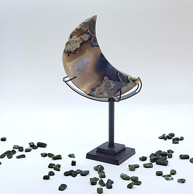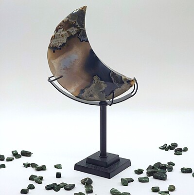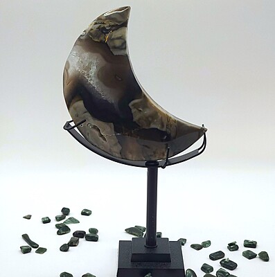 Our volcano agate moons are truly fabulous pieces. They boast a sleek, yet understated look in regular lighting, but bring the pizzazz under UV light. Each piece is unique. We have one with light agate and geode-like formations are found within it. The lovely drusy one has fully formed crystals (see photos). The dark agate piece has a fantastic varied agate formation in the center. We have three of these amazing moons. Each comes with its own stand. Get yours before they are gone!