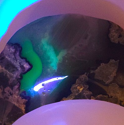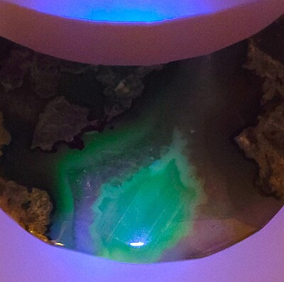 - UV Notes: For gemstones, 365nm is the best for UV lighting. Only some specimens illuminate under the other part of this spectrum (370-400nm). This is why some pictures are not as clear for our UV reactive pieces. Our current lights are at 365nm, but used to be 395mm only. For home use, the 395nm is less expensive, but in some cases, will need a zoomed beam on the flashlight style UV lights. If you do use a 365nm light, please take care to use eye protection.