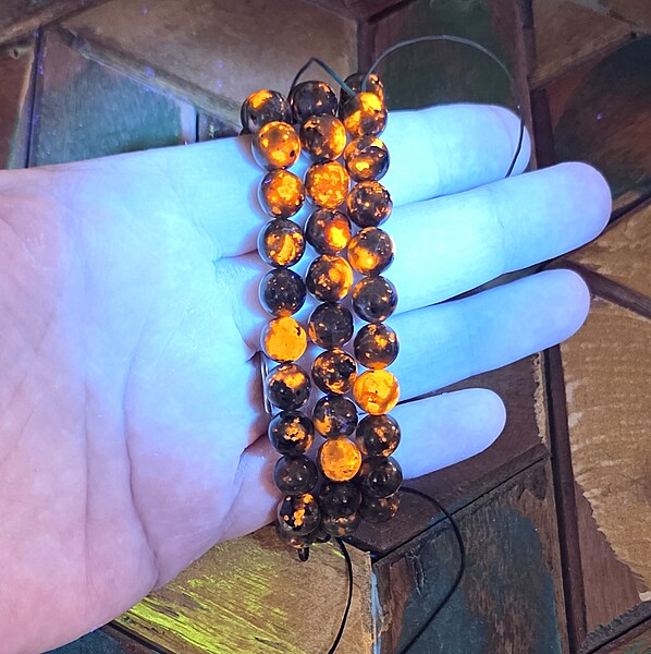 Take a look at our incredible UV reactive yooperlite bracelets with classic gray and black patterns. Once illuminated under UV, they glow a beautiful bright orange!