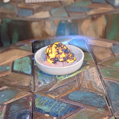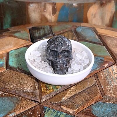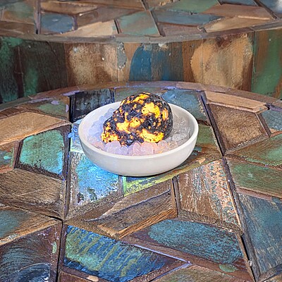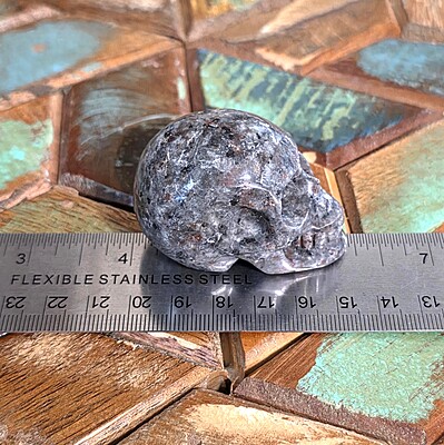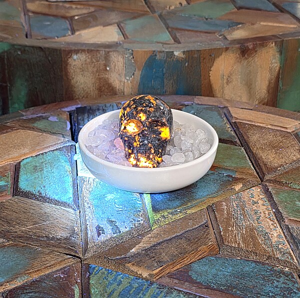 Our yooperlite skull is gorgeous. With it's classic color in natural light, and its bright show under UV lighting, it is a fun addition to any living space. Skulls are the perfect addition for an ancestor altar and so much more. No matter what you use your skull for, this yooperlite skull will be a wonderful piece for your collection.
